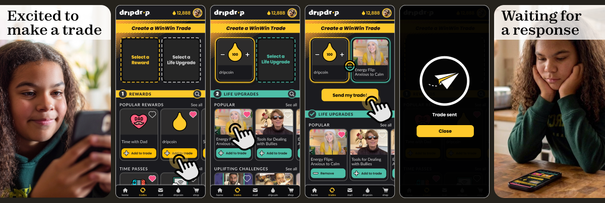 dripdrop was a mental fitness app for families that used a barter system to encourage mental fitness in tweens. Tweens levelled up their resiliency by completing real world activities or in-app video lessons in exchange for things they wanted, like quality time with dad or an hour of gaming time.