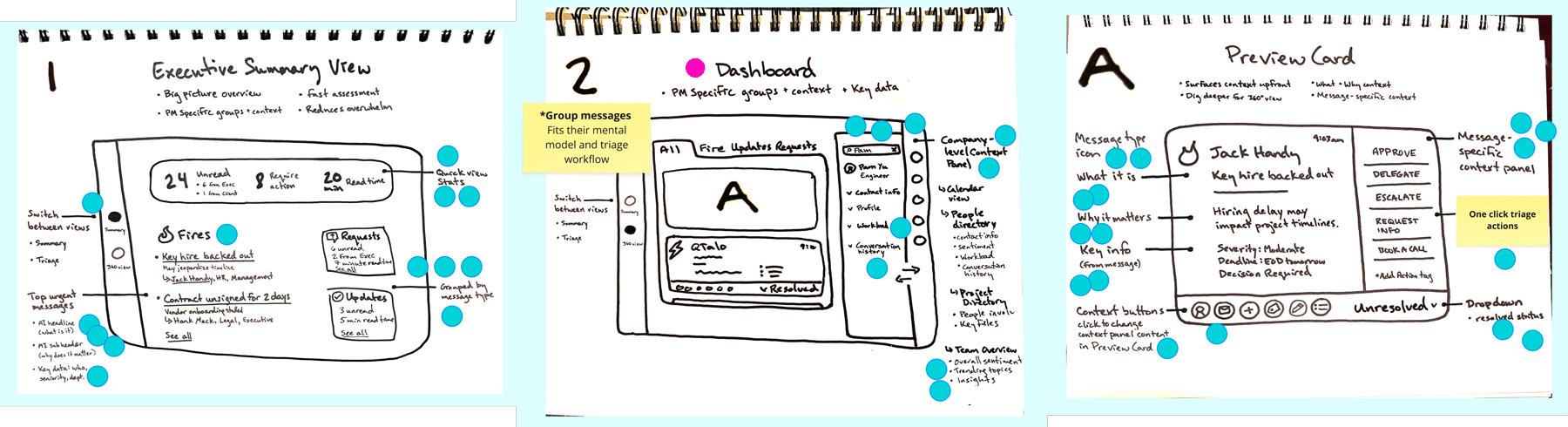 Through structured ideation exercises, the team converged on a critical insight: the solution needed to fully facilitate a project manager's triage process, not just unify disparate messages. That reframed the product from "another inbox" to a decision-making layer for project communication.