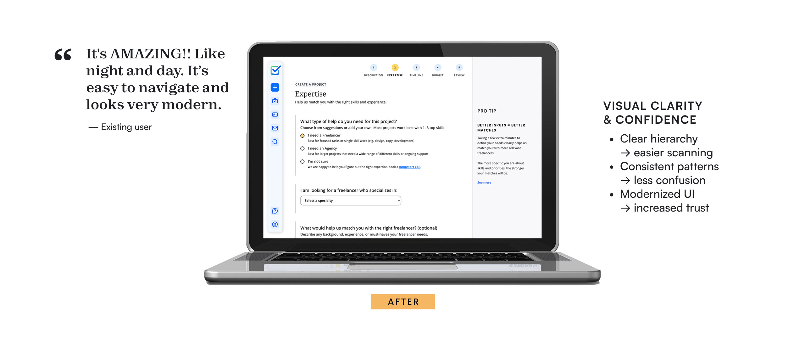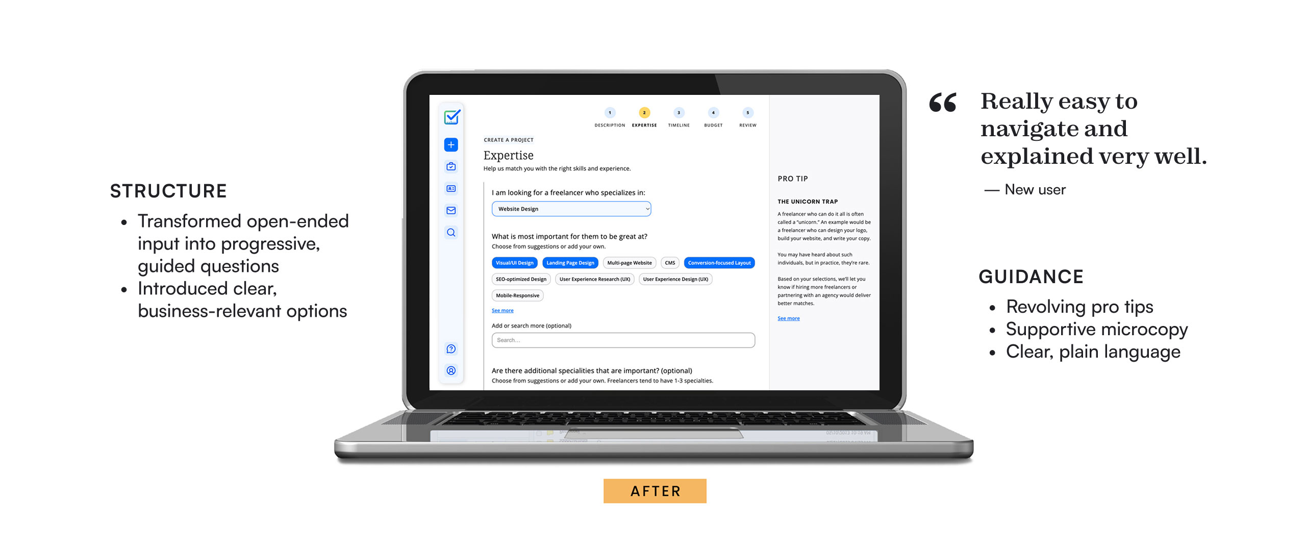 Structured user input: Transformed open-ended text fields into guided questions with suggested inputs, making it easier to define needs without hiring expertise.